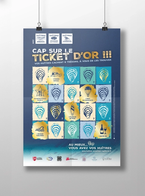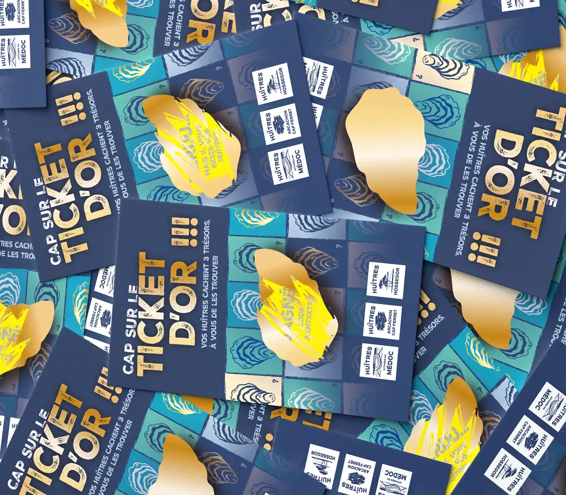 Pour dynamiser la vente d’huîtres du bassin d’Arcachon Cap-Ferret, Médoc, et Hossegor, l’agence MCOMM a lancé une inventive campagne de publicité : une chasse au trésor captivante. À chaque achat de bourriches auprès des ostréiculteurs, les consommateurs pouvaient découvrir l’un des 10,000 tickets à gratter, et pour trois chanceux un lot à couper le souffle.