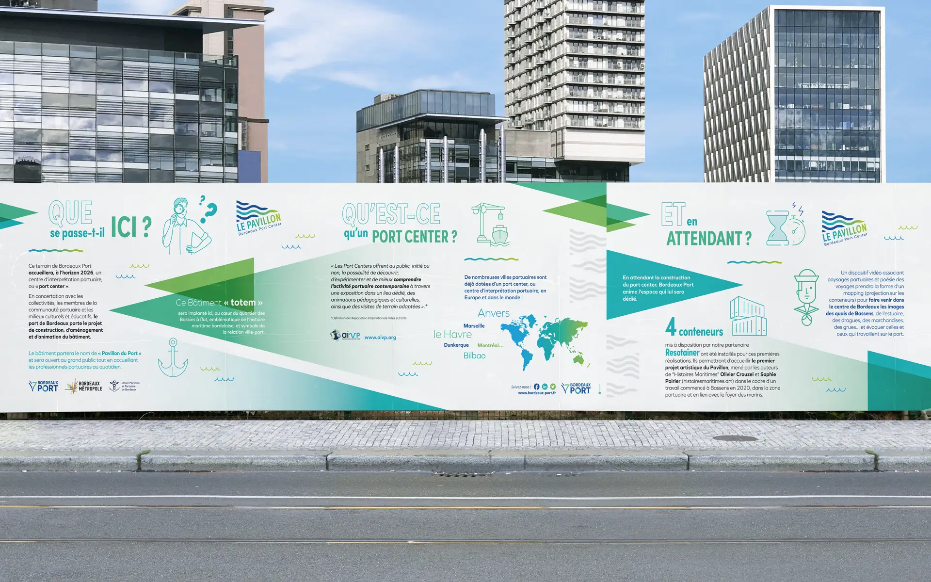 MCOMM a conçu un logo et une charte graphique qui se veulent à la fois porte-voix du dynamisme portuaire et invitation à la découverte. L’approche visuelle intègre des éléments ludiques et interactifs, préfigurant l’expérience enrichissante que proposera LE PAVILLON.